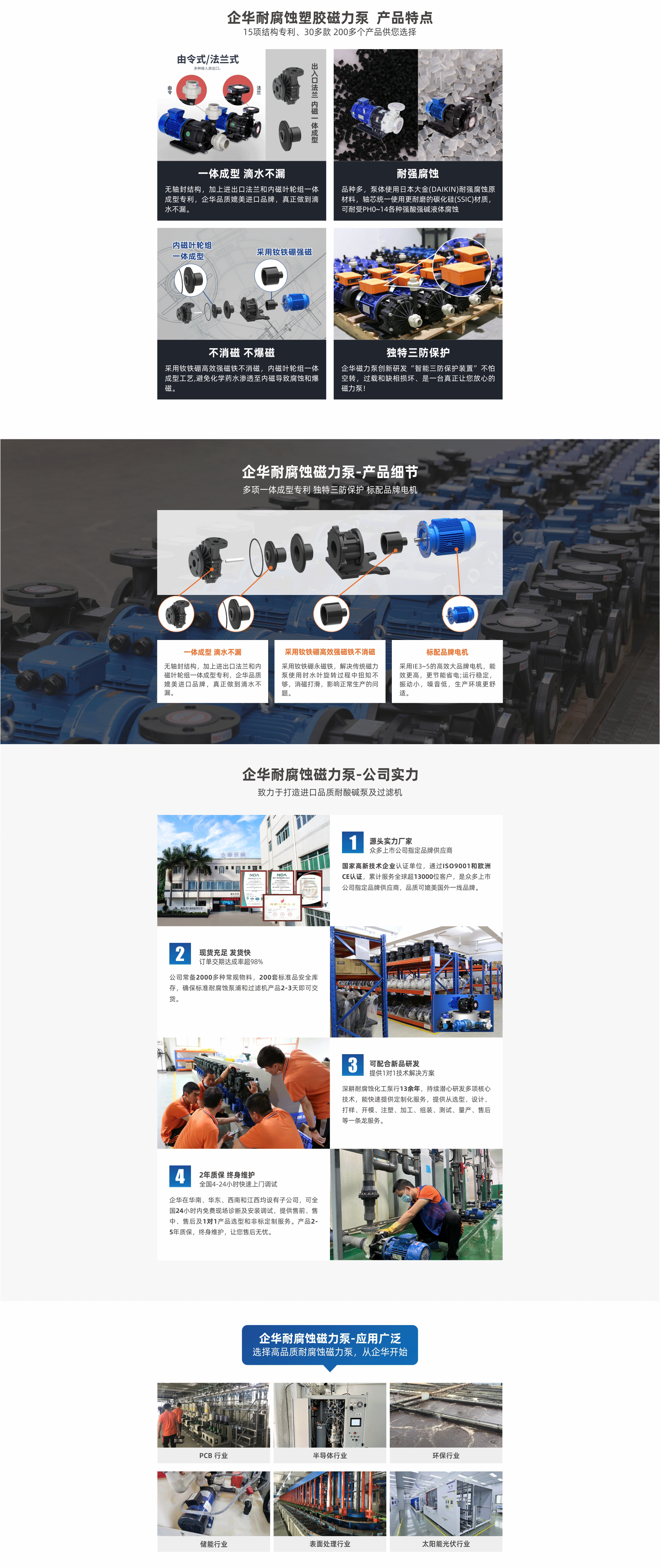 耐強腐蝕,進出口法蘭一體成型專利滴水不漏;采用欽鐵硼高效強磁不消磁,內磁葉輪體成型不爆磁;多種泵頭材質、流量大震動小、噪音低,可另配“智能三防保護裝置”,拒絕空轉損壞。